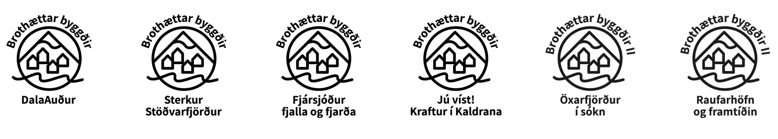 Táknið fyrir verkefnið Brothættar byggðir er hringur þar sem innan í eru hús og fjall fyrir ofan en hringinn sker bylgjulaga hafflötur að neðanverðu.